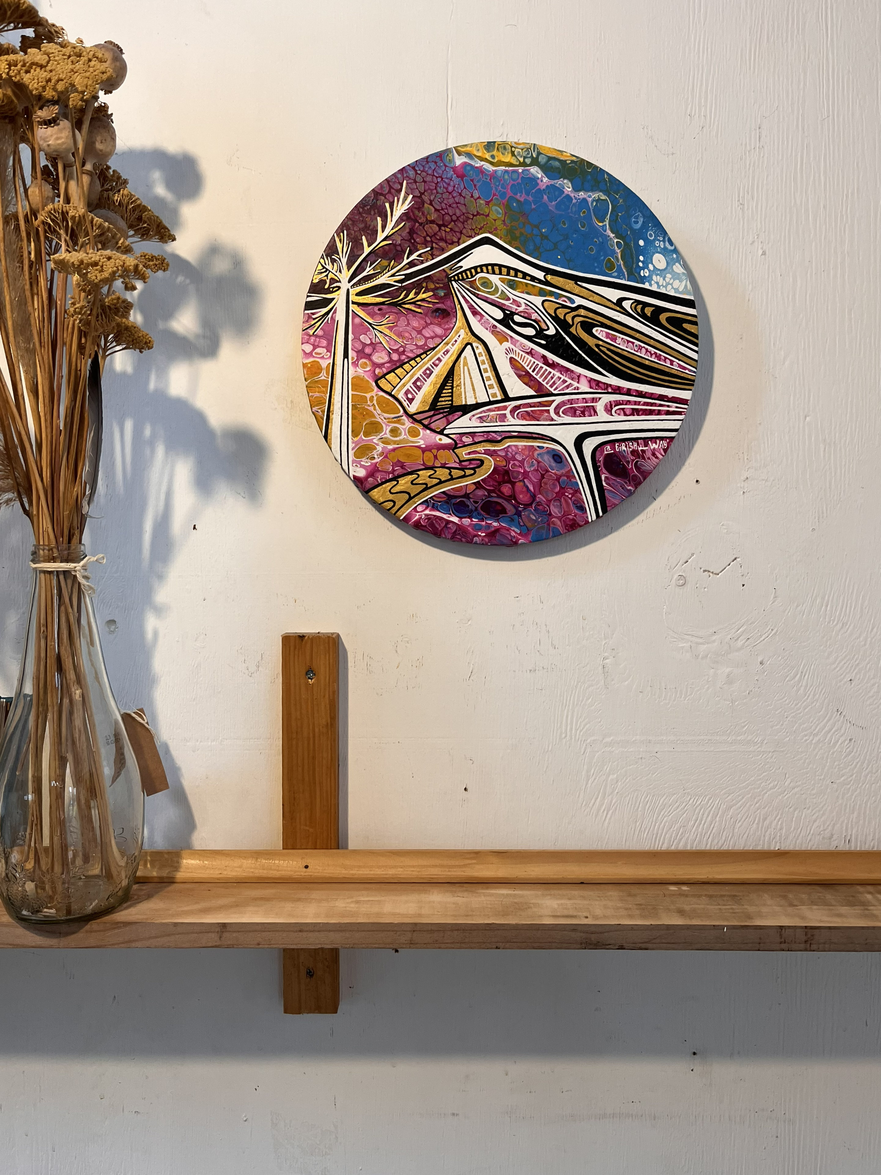La primera es la preparación del fondo mediante la técnica de arte fluido. Se vierten en capas distintos colores de pintura acrílica en un mismo vaso y luego se aplican sobre el lienzo, permitiendo que al desplazarse se mezclen y formen patrones y texturas únicos.
