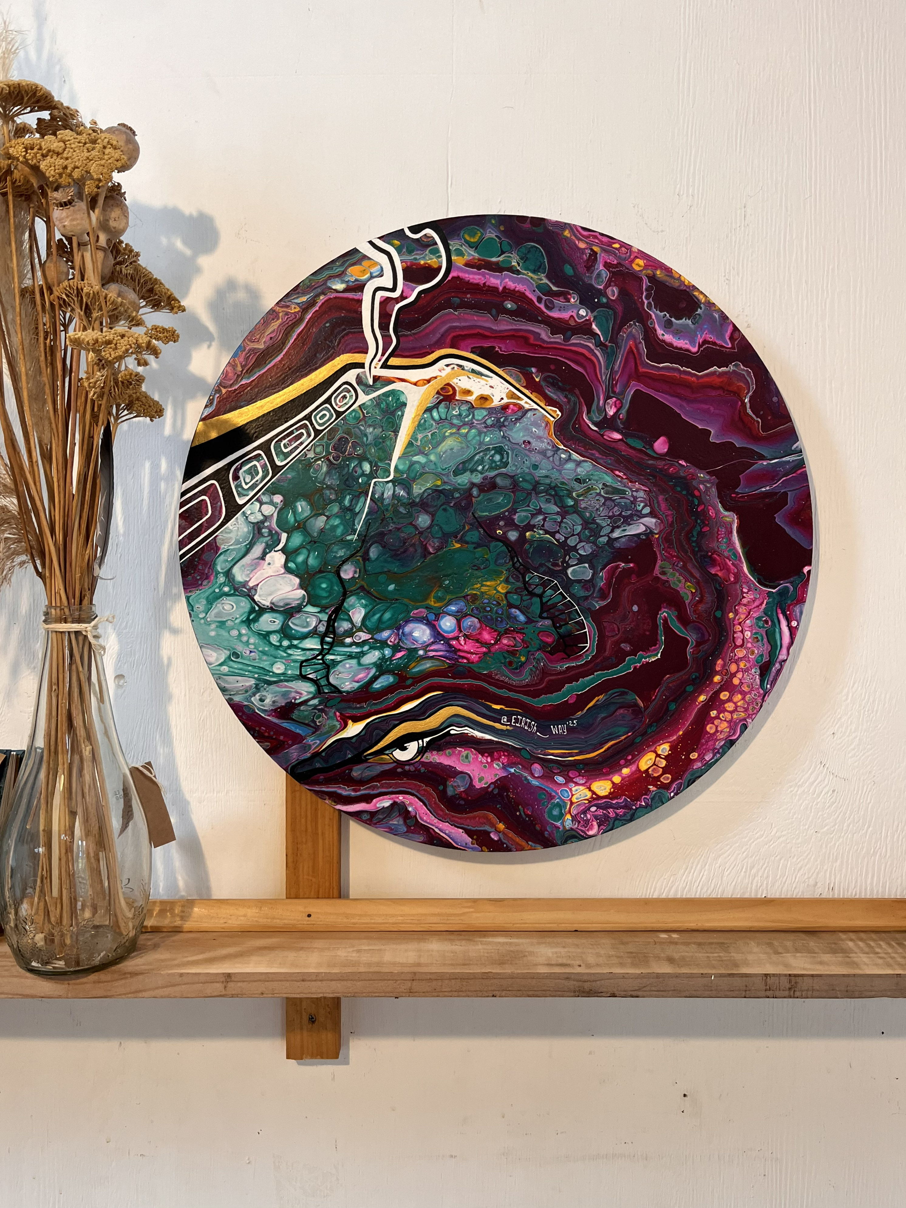 Finalmente, la tercera etapa es la intervención gráfica mediante trazos en acrílico negro, blanco y dorado, que definen la figura, resaltan detalles y aportan contraste y profundidad a la composición.